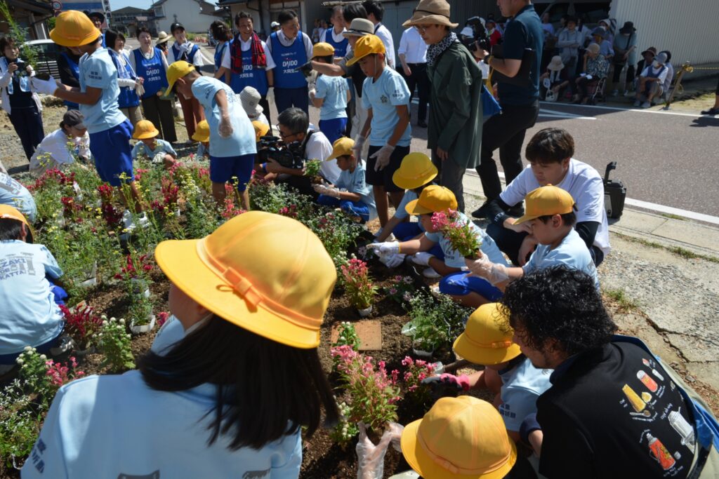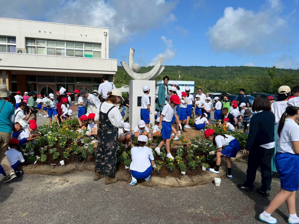 能登島小学校の正門を入ってすぐ、「すこやか」モニュメント周辺に、小学生の皆さんと一緒にお花型のガーデンをつくりました。