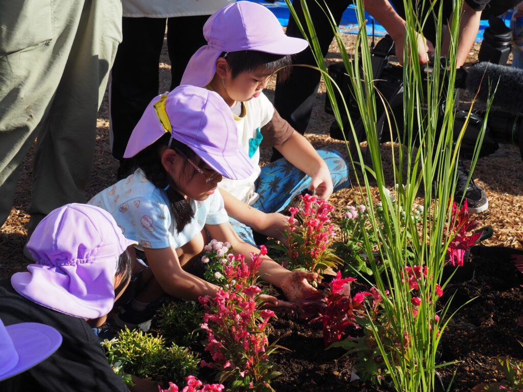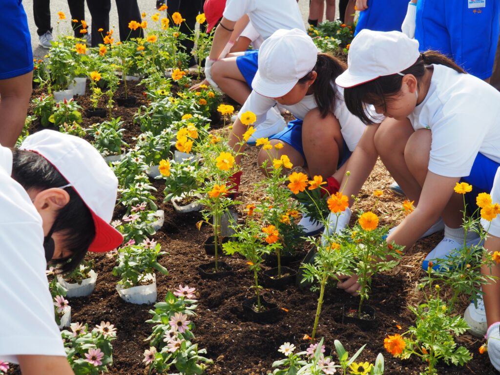 当日は100名以上の全校児童とともに花を植えました。子どもたちはお手入れの方法についても、熱心に話を聞いてくれました。