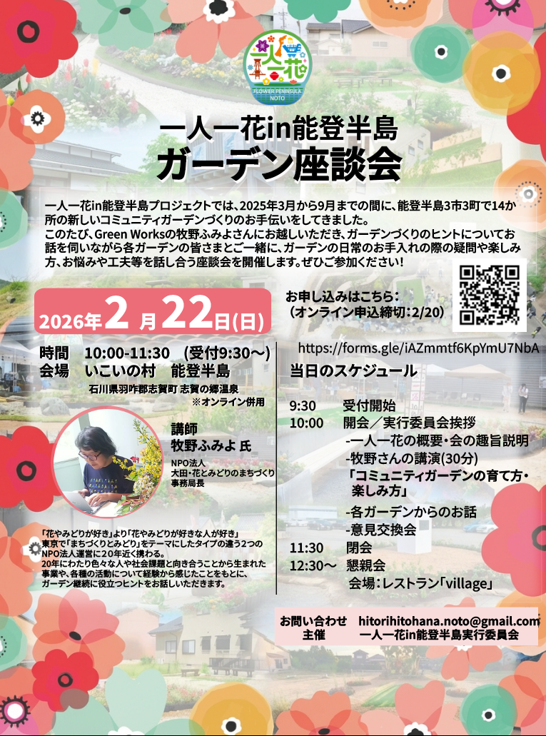 この度コミュニティガーデン事業に長年携わっておられる牧野ふみよ氏をお呼びして、ガーデン座談会を行います。当日会場には既存ガーデンのお手入れをして下さっている地域の方々(約50名)がご参加予定となっておりますが、どなたでもオンラインでのご参加が可能です。