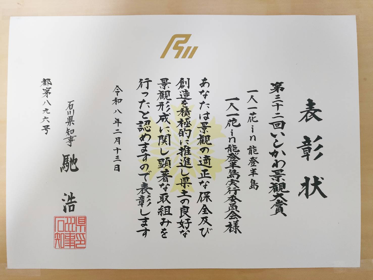 2026年2月13日,石川県庁で「第32回いしかわ景観大賞」の表彰式があり,代表の岡田翔太郎とガーデンチームの徳永哲が,馳浩知事から表彰状を授与されました。